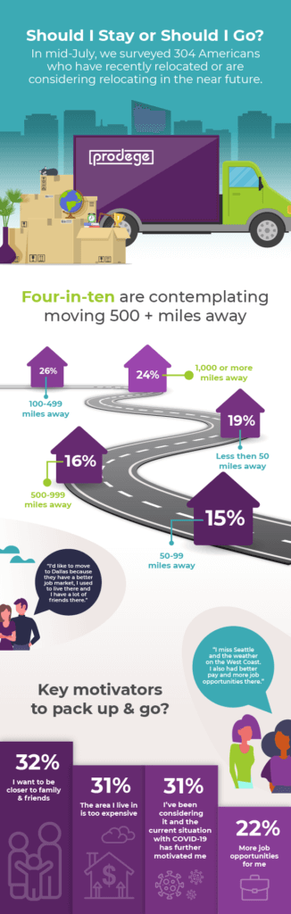 In addition to casting a relatively wide net in terms of distance, being closer to family & friends and/or moving to a more affordable area emerge as key relocation considerations. When asked to elaborate about her recent move, one respondent explains: “I relocated to the Big Island of Hawaii because my parents live here, and I need to be closer to them due to their age.”