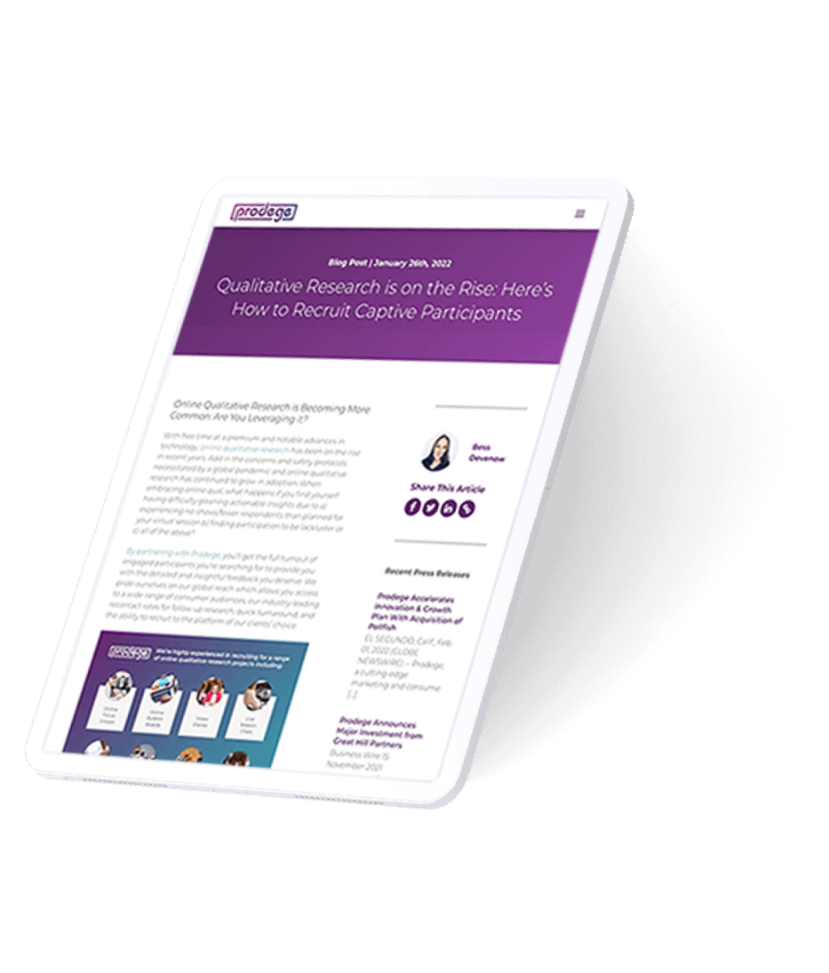 Working with Prodege has allowed us to provide quality sample and a smooth recruitment process from beginning to end for our large-scale qual sessions. We can always count on the team for fast recruitment programming, excellent screening and quota delivery, low incidence rate audiences, and timely turnaround for all our projects. The customer service of their project management team is unmatched.
